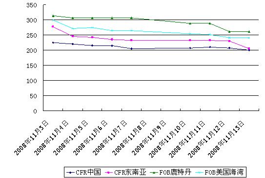 東南亞市場(chǎng):中國(guó)價(jià)格對(duì)該地市場(chǎng)價(jià)格影響深遠(yuǎn),該地區(qū)下游開(kāi)工率持續(xù)低迷的形勢(shì)仍未好轉(zhuǎn)、侵襲全球的金融風(fēng)潮在該地大有愈演愈烈之勢(shì),交投雙方商談不暢,市場(chǎng)鮮有確認(rèn)的交易。本周四閉市時(shí),該地收盤價(jià)收于200-210美元/噸CFR東南亞,較前期大幅下跌30美元/噸。