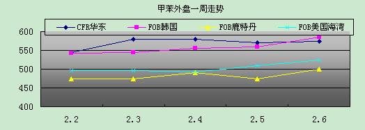 本周甲苯外盤(pán)價(jià)格較上周末各地價(jià)格有所增長(zhǎng)。在CFR中國(guó)市場(chǎng),由于場(chǎng)內(nèi)受到二甲苯在中國(guó)需求影響,下游對(duì)二甲苯供應(yīng)緊張,所以甲苯價(jià)格被進(jìn)一步的推漲。周末亞洲CFR中國(guó)收盤(pán)價(jià)在574.5-575.5美元/噸,較上周末上漲了34.5/25.5美元/噸,F(xiàn)OB韓國(guó):584.5-585.5美元/噸,與上周末價(jià)格相比,上漲了69.5/65.5美元。歐美國(guó)家,市場(chǎng)商談氣氛也有所回暖,但是實(shí)際成交依舊不多。FOB鹿特丹:498-502美元/噸,上漲了53/42美元;FOB美國(guó)海灣:464-494美元/噸,上漲了58/31美元。