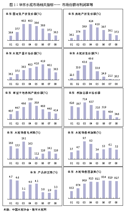 2008年全球經(jīng)濟(jì)危機(jī)的刺激下,需求壓力、煤炭成本壓力在華東地區(qū)表現(xiàn)的尤為明顯。但前期的技術(shù)調(diào)整、結(jié)構(gòu)調(diào)整造就了一批大水泥企業(yè),這些水泥企業(yè)成為了在經(jīng)濟(jì)下滑下市場的中流砥柱,成為2008年華東市場在需求有所下降背景下保住利潤的最直接力量。華東地區(qū)開始走向以市場為導(dǎo)向的結(jié)構(gòu)調(diào)整。