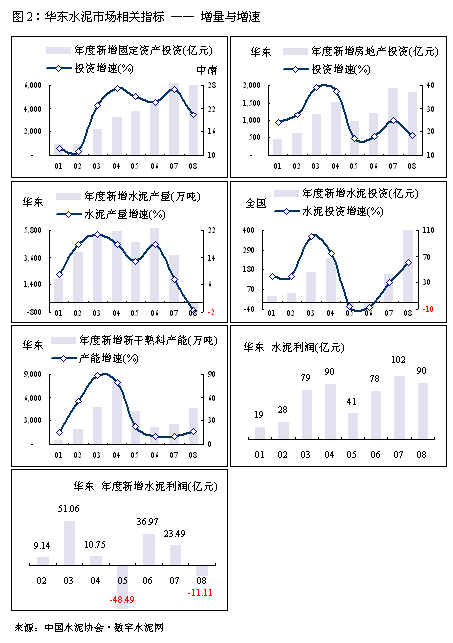 進(jìn)入“十一五”,華東地區(qū)(特別是上海、浙江等高速發(fā)展城市)基礎(chǔ)設(shè)施建設(shè)逐步完成,國家投資向中西部地區(qū)轉(zhuǎn)移。華東區(qū)固定資產(chǎn)投資、房地產(chǎn)投資等所占比重降低,上升動力減弱,水泥需求逐漸趨于穩(wěn)定,華東區(qū)水泥市場率先進(jìn)入了成熟期。水泥投資所占份額隨之有所減弱,但前期大規(guī)模的生產(chǎn)線建設(shè),由于市場的回落,供需失衡,產(chǎn)能嚴(yán)重過剩,導(dǎo)致利潤持續(xù)走低,至2008年占全國利潤僅為34.6%,較2003年跳水一半。企業(yè)之間競爭激烈,大規(guī)模的并購出現(xiàn),市場進(jìn)入了新一輪的結(jié)構(gòu)調(diào)整。