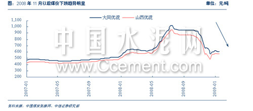 中信證券首席分析師潘建平也贊同了這個(gè)觀點(diǎn),他認(rèn)為2009年煤價(jià)保持趨勢(shì)性回落已成必然趨勢(shì),2009年煤炭均價(jià)將比2008年下降15%左右,相應(yīng)可以降低水泥成本約6%。