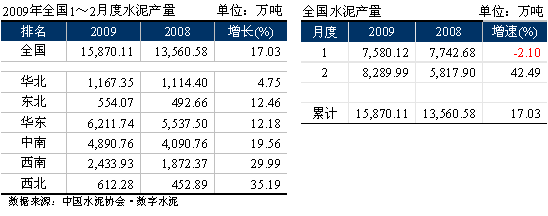 ◆ 1~2月水泥產(chǎn)量份水泥產(chǎn)量1.59億噸,同比增長17.03%; ◆ 其中1月份產(chǎn)量為7,580萬噸,同比下降2.10%;2月份產(chǎn)量為8,290萬噸,同比增長42.49%; ◆ 西南、西北地區(qū)增速超過30%。 點(diǎn)評: 由于去年2月份有雪災(zāi)和春節(jié)因素,所以今年2月份水泥產(chǎn)量的異常高增長并不能說明需求的好轉(zhuǎn); 3月份是水泥需求轉(zhuǎn)旺的開始,預(yù)計(jì)3月份水泥產(chǎn)量環(huán)比還會(huì)增加 (去年為1.13億噸); 2008年3月份雪災(zāi)后水泥需求集中釋放,水泥產(chǎn)量同比增長26%,今年3月份水泥產(chǎn)量同比增速將會(huì)大幅回落。