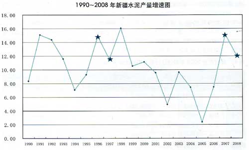 從1990~2008年的統(tǒng)計數(shù)據(jù)看,1998年水泥產(chǎn)量增速最高達16.07%,2005年水泥產(chǎn)量增速最低僅僅為2.37%;這18年的年均增長率為10.43%,“八五”期間水泥產(chǎn)量年均增速為11.44%,“九五”期間水泥產(chǎn)量年均增速為12.83%,“十五”期間水泥產(chǎn)量年均增速為6.75%,“十一五”前三年水泥產(chǎn)量年均增速11.04%.2007、2008年新疆水泥產(chǎn)量增長率與亞洲經(jīng)濟風暴前兩年水泥產(chǎn)量增速相比有驚人的相似,都保持了12%以上的高速增長。從全疆水泥運行規(guī)律看,2009年水泥產(chǎn)量高速增長是可能的。“十五”期間新疆水泥產(chǎn)量年均增速6.75%,遠低于“八五”、“九五”期間水泥產(chǎn)量增速,也低于歷年平均增速,“十一五”期間水泥產(chǎn)量高速增長是符合經(jīng)濟運行規(guī)律的。
