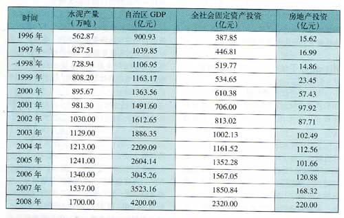 自治區(qū)提出要確保2009年全區(qū)GDP增長在9%以上,固定投資增長25%.因此預(yù)計2009年全區(qū)的GDP達4500億元,全社會固定投資2900億元,房地產(chǎn)投資195億元(數(shù)據(jù)來源:區(qū)房產(chǎn)協(xié)會專家),全區(qū)水泥需求量為1904萬噸。