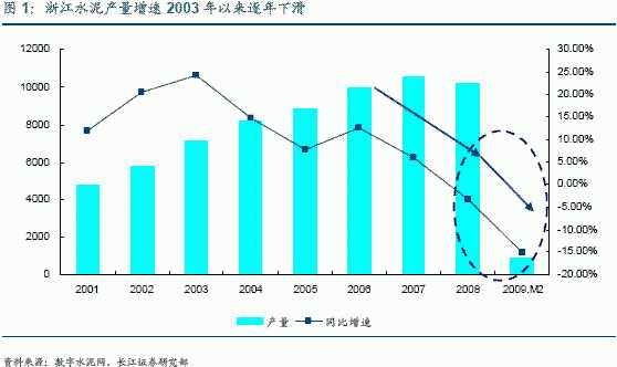 浙江水泥市場(chǎng)面臨最大問(wèn)題是產(chǎn)能?chē)?yán)重過(guò)剩據(jù)悉,浙江目前水泥產(chǎn)能約為1.4億噸,且絕大部分為新型干法,未來(lái)沒(méi)有落后產(chǎn)能淘汰;2008年全省水泥產(chǎn)銷(xiāo)量約為1億噸;2008年全省供需缺口為4000萬(wàn)噸,開(kāi)工率約為70%; 2009年一季度開(kāi)工率約為60%,產(chǎn)能?chē)?yán)重過(guò)剩困擾著浙江的水泥企業(yè);水泥需求萎靡,未來(lái)增長(zhǎng)仍取決于房地產(chǎn)浙江水泥需求在2003年達(dá)到巔峰,2004年宏觀調(diào)控以來(lái)增速一直在下滑,尤其是2008年金融危機(jī)以后,增速在加速下滑,同比負(fù)增長(zhǎng)。