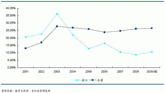 和水泥需求相對(duì)應(yīng),浙江固定資產(chǎn)投資自2003年到高峰以來(lái),增速一直低于全國(guó)平均水平,而且逐年下滑,基本和水泥產(chǎn)量增速變化趨勢(shì)相符合。