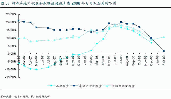 從近兩年的月度分項(xiàng)數(shù)據(jù)來(lái)看,2008年6月以前房地產(chǎn)投資和基礎(chǔ)設(shè)施投資一抑一揚(yáng),固定資產(chǎn)投資保持緩慢上升的趨勢(shì);但是2008年6月以后房地產(chǎn)投資和基礎(chǔ)設(shè)施建設(shè)投資增速同時(shí)下滑,導(dǎo)致固定資產(chǎn)投資增速也一路下滑;那么固定資產(chǎn)投資在全國(guó)基建大干快上的情況下能不能拉動(dòng)浙江水泥需求?