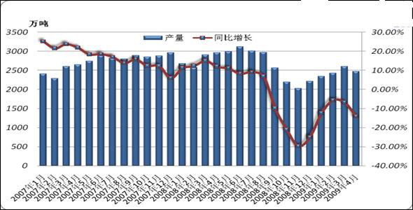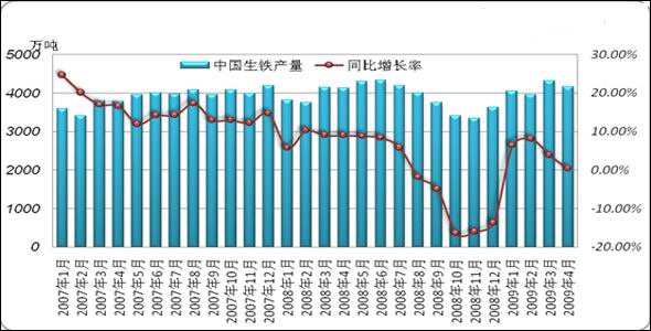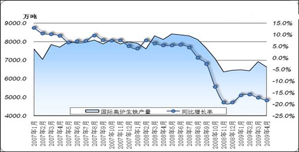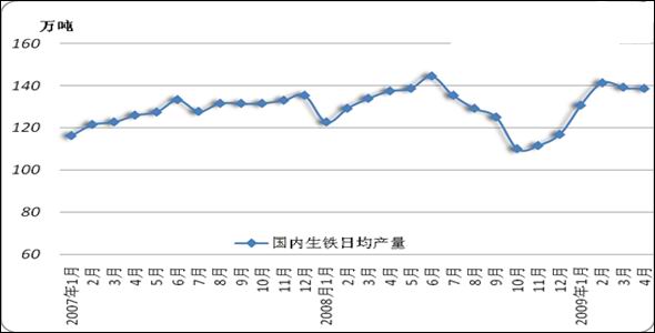 『國內(nèi)方面』2009 年4月份,我國共生產(chǎn)生鐵4163.08萬噸,比去年同期增加了15.78萬噸,同比增長了0.4%;與今年3月份相比減少了158.71萬噸,環(huán)比減少了3.67%。此外,4月份我國生鐵的日均產(chǎn)量為138.77萬噸,比3月份的139.41萬噸略有下降,與去年同期相比增長了0.8%。見圖3、圖4.