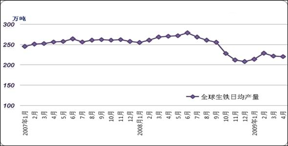 圖2 2007-2009年全球生鐵產(chǎn)量日均走勢圖