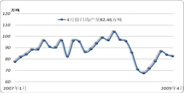 2009年4月份,中國共生產(chǎn)焦炭2473.65萬噸,比去年同期減少405.27萬噸,同比下降14.1%。今年前4個月全國累計生產(chǎn)焦炭 9840.27萬噸,比去年同期累計減少890.02萬噸,累計下降幅度為8.3%。受4月份鋼材行情低迷影響,對焦炭需求也呈現(xiàn)出疲弱態(tài)勢,焦化廠在此形勢下繼續(xù)實施“限產(chǎn)保價”策略,大部分焦炭企業(yè)限產(chǎn)幅度均在50%左右。此外,因國外鋼廠限產(chǎn)壓產(chǎn)力度較大,對焦炭需求也明顯減弱,這在一定程度上也加重了國內(nèi)焦化企業(yè)的警惕性,產(chǎn)量明顯受到抑制。4月份,我國焦炭日均產(chǎn)量水平繼續(xù)回落。見圖5、圖6。