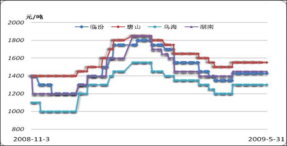 截止到2009年5月底,全國主要區(qū)域焦炭市場的波動情況如下: