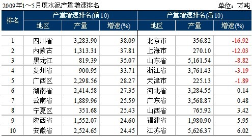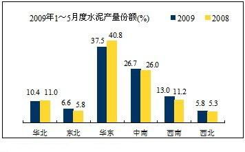 根據(jù)數(shù)字水泥網(wǎng)統(tǒng)計(jì)顯示,1~5月水泥產(chǎn)量57,336萬噸,同比增長(zhǎng)13.34%。按產(chǎn)量份額來看,表現(xiàn)最為明顯的是華東地區(qū)從2008年占全國的40.8%降到37.5%,下降3個(gè)百分點(diǎn);西南增長(zhǎng)2個(gè)百分點(diǎn),而西北增長(zhǎng)較慢,與之冬季有關(guān),有近5個(gè)月施工淡季;產(chǎn)量增長(zhǎng)最快的是四川,內(nèi)蒙、黑龍江和貴州;北京、上海、山東、浙江、天津?yàn)樨?fù)增長(zhǎng)。