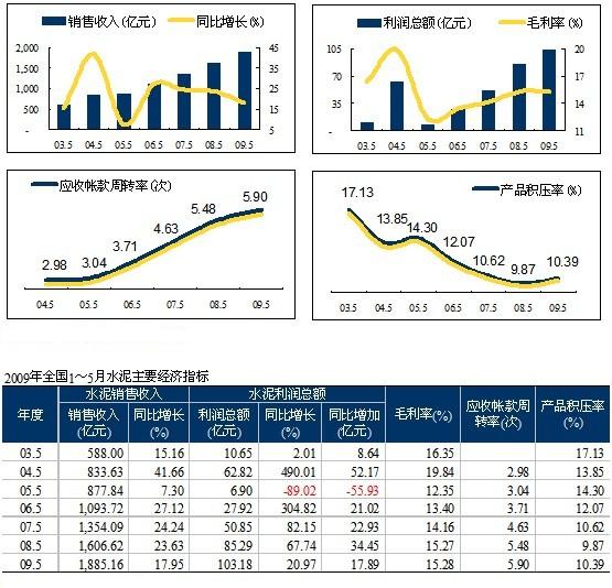 1~5月水泥工業(yè)的總體運(yùn)行情況是:在產(chǎn)量大幅提升的背景下,經(jīng)濟(jì)指標(biāo)繼續(xù)向好,銷售收入、利潤總額同比增長(zhǎng),銷售利潤率,應(yīng)收賬款周轉(zhuǎn)率上升,產(chǎn)品積壓率微升的良好局面。但區(qū)域分化明顯,主要的利潤增長(zhǎng)點(diǎn)在西部地區(qū),而且區(qū)域利潤水平表現(xiàn)平平。
