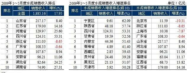 1~5月,水泥產(chǎn)業(yè)實(shí)現(xiàn)銷售收入1885.16億元,同比增長(zhǎng)17.95%。銷售收入增速前10名的地區(qū)的增速都在30%以上:寧夏省銷售收入大幅上漲62.09%;四川在繼2007年收入大幅增長(zhǎng)的情況下,受災(zāi)后重建拉動(dòng),市場(chǎng)仍然向好,實(shí)現(xiàn)了124.31億元的銷售收入,同比增長(zhǎng)53.31%。增速前10 的4個(gè)地區(qū)位于西北,三個(gè)位于西南。