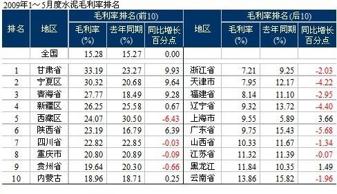 毛利率排名后10的多為沿海地區(qū),大部分地區(qū)低于去年同期水平。2009年水泥市場(chǎng)需求旺盛超出預(yù)期,煤、油原燃料的供應(yīng)情況也好于去年,但產(chǎn)業(yè)的利潤情況沒有得到明顯改善,主要是礙于產(chǎn)能釋放的壓力。去年8月,數(shù)字水泥網(wǎng)根據(jù)對(duì)水泥投資的追蹤,感覺到迅速擴(kuò)張的產(chǎn)能將在2008年底和2009年釋放,面對(duì)去年3季度開始的市場(chǎng)需求下滑態(tài)勢(shì),勢(shì)必對(duì)水泥市場(chǎng)造成巨大的壓力。因此,9月在北京連續(xù)兩天召開市場(chǎng)研討會(huì),業(yè)界人士與資本市場(chǎng)行業(yè)分析師及相關(guān)媒體共同對(duì)市場(chǎng)的走勢(shì)進(jìn)行分析,中國水泥協(xié)會(huì)會(huì)長(zhǎng)雷前治親臨會(huì)場(chǎng)發(fā)言。會(huì)后,數(shù)字水泥網(wǎng)又走訪了海螺、冀東等水泥集團(tuán),交流了對(duì)市場(chǎng)的看法,警示行業(yè)和企業(yè)對(duì)市場(chǎng)風(fēng)險(xiǎn)的關(guān)注。