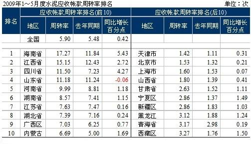 隨著銷售收入的快速增長(zhǎng),1~5月應(yīng)收賬款有所上升,為341.96億元,同比上升了15.66%,上升幅度在合理范圍。應(yīng)收賬款周轉(zhuǎn)率卻較2008年同期加快0.42,達(dá)到5.90次。在應(yīng)收賬款周轉(zhuǎn)率排名前10的地區(qū)中,海南、江西、四川和山東在10次以上,河南接近10;天津、北京、上海三大直轄市回款現(xiàn)象都不佳,值得注意的是應(yīng)收賬款周轉(zhuǎn)率排名后10中有4個(gè)是西北地區(qū),利潤重要,拿到現(xiàn)金更為重要,不但要叫好還要叫座。