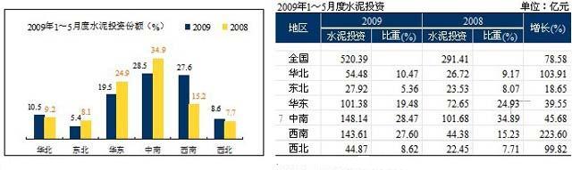 過于旺盛的市場(chǎng)需求也引來高熱度水泥投資,2009年1~5月水泥投資仍然延續(xù)2908年的強(qiáng)勢(shì)。2008年1~5月水泥投資比2007年增長(zhǎng)60%,而今年1~5月增長(zhǎng)勢(shì)頭更加強(qiáng)勁達(dá)到78.58%。如果下半年投資不放緩,對(duì)未來市場(chǎng)的壓力將會(huì)越來越大。