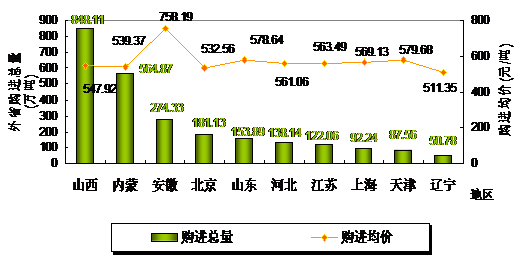 從調(diào)入的來源地統(tǒng)計(指煤炭經(jīng)營企業(yè)購入煤炭時銷貨方注冊登記所在地),從山西購進848.11萬噸,占調(diào)入總量的30.69%;其次是內(nèi)蒙和安徽,分別購進564.87萬噸和274.33萬噸,占調(diào)入總量的20.44%和9.93%(見圖1)。