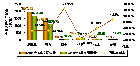 圖4:2009年一季度全省各行業(yè)用煤與去年同比變化情況