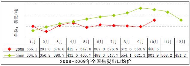 10 月份,焦炭市場(chǎng)延續(xù)總體下跌走勢(shì),后期跌幅趨緩,限產(chǎn)效果明顯,日均產(chǎn)量呈回落趨勢(shì),國(guó)際焦炭需求出現(xiàn)回暖跡象,我國(guó)焦炭出口均價(jià)回升幅度較大,但出口量仍無(wú)起色。