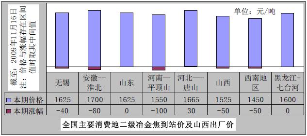 3.市場(chǎng)需求依然低迷,價(jià)格總體下跌。10 月份,焦炭市場(chǎng)延續(xù)前期下跌走勢(shì),跌勢(shì)有所減緩,焦化企業(yè)限產(chǎn)措施效果逐步顯現(xiàn),加之鋼廠出現(xiàn)補(bǔ)庫(kù)需求,進(jìn)入11 月,焦炭?jī)r(jià)格出現(xiàn)企穩(wěn)反彈的趨勢(shì),河北地區(qū)尤為明顯,11 月7 日,河北焦協(xié)建議焦化廠上浮出廠價(jià)30-50元。數(shù)據(jù)顯示,截至11 月16 日,監(jiān)測(cè)區(qū)域內(nèi)山西、河南平頂山、江蘇無(wú)錫、安徽淮北及西南地區(qū)仍在下跌,河北唐山小幅反彈,山東和東北地區(qū)維持穩(wěn)定。