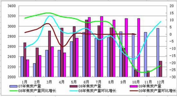 2009 年10 月中國焦炭產(chǎn)量為3153.19 萬噸,與上月基本持平,而去年同月產(chǎn)量只有2141.38 萬噸,同比增長47.25%。10 月份的鋼材市場整體處于震蕩盤整運行的態(tài)勢,盡管鋼價仍有陰跌的現(xiàn)象,但是鋼廠并未有減產(chǎn)意識,基本都開足馬力生產(chǎn),10 月份粗鋼產(chǎn)量為5175 萬噸,同比增長42.4%,環(huán)比增長2%,意味著焦炭的下游市場并沒有萎縮。因此盡管焦化行業(yè)協(xié)會建議限產(chǎn)60%,但是大部分企業(yè)并沒有執(zhí)行,滿負(fù)荷生產(chǎn)現(xiàn)象純屬普遍,產(chǎn)能過,F(xiàn)象嚴(yán)重,這也是造成10 月中上旬焦炭滯銷的主要原因,盡管山西焦協(xié)建議10月份焦炭價格與上月持平,但是仍然沒有阻擋住各地焦炭價格的下行,各地焦炭價格與9月份相比都有50 元左右的下滑。1-10 月焦炭累計產(chǎn)量為2.85 億噸,去年同期產(chǎn)量2.72億噸,同比增長4.8%。