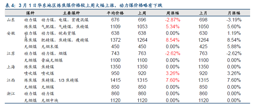 3月1日華東地區(qū)煉焦煤價格較上周大幅上漲,動力煤價格略有下跌