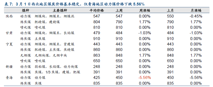 3 月1 日西北地區(qū)煤炭價格基本穩(wěn)定,僅青海地區(qū)動力煤價格下跌5.56%