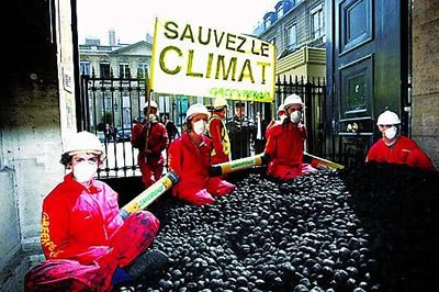 圖片為2009年6月23日,“綠色和平”環(huán)保組織成員將煤傾倒在位于巴黎的法國生態(tài)部門前并舉行靜坐示威,以抗議法國在西北部瑟堡港興建煤炭碼頭的計(jì)劃。在歐盟,類似這樣反對發(fā)展煤炭工業(yè)的抗議活動時(shí)有發(fā)生。