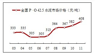 2011年水泥市場仍然延續(xù)高需求、高供給的市場運行軌跡,但和往年最大的不同是,價格曲線有了很大變化,就全國范圍講, 價格已脫離了長期在運行在300元/噸的低價軌道,2008年以后,一是4萬億投資拉動了市場需求,二是借煤炭價格的上漲,在水泥大企業(yè)的帶動下較好地轉(zhuǎn)移了上游的上漲成本,水泥價格開始向400元/噸沖擊?梢哉f這是進(jìn)入”十二五”對水泥產(chǎn)業(yè)的最大利好。水泥產(chǎn)業(yè)擺脫了長期以來市場低迷得尷尬境地,上游、下游價格上漲,水泥價格原地踏步,甚至走低,使產(chǎn)業(yè)的發(fā)展受到了嚴(yán)重挑戰(zhàn)。在10年水泥工業(yè)高速發(fā)展中成長起來的兩位”大佬”海螺郭文叁、中國建材宋志平攜手進(jìn)入”十二五”,都認(rèn)為未來10年是水泥發(fā)展的黃金10年。