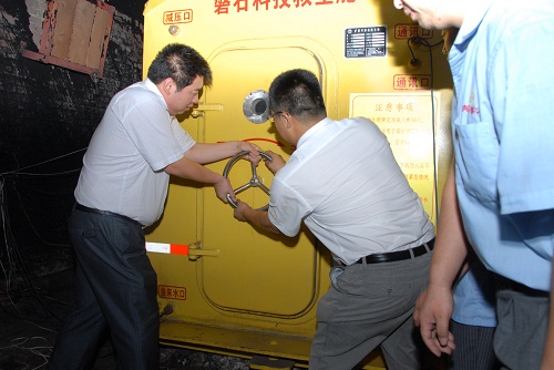 上圖:艙外國家安全生產(chǎn)重慶礦用設(shè)備檢測中心工作人員全程監(jiān)督實驗過程