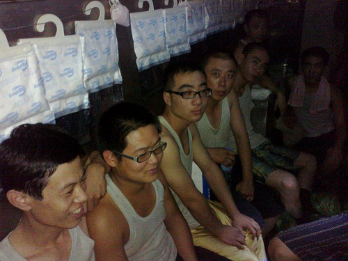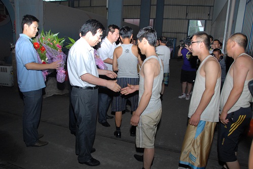 上圖:7月31日6點整,磐石容器集團總經(jīng)理李國軍(左一)打開了艙門
