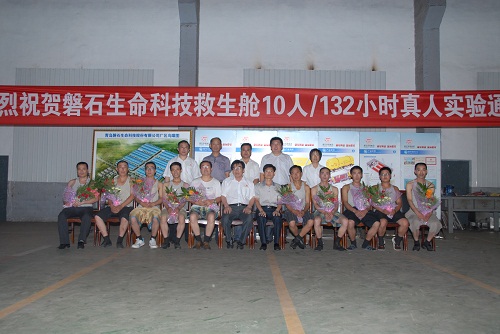 7月31日上午6時整,總經(jīng)理李培學(xué)親自帶隊,在磐石生命科技救生艙內(nèi)生活了132小時的10名志愿者出艙了,經(jīng)過醫(yī)務(wù)人員現(xiàn)場體檢各項生命指標正常。國家安全生產(chǎn)重慶礦用設(shè)備檢測中心的工作人員表示“磐石生命科技救生艙10人/132小時真人綜合防護實驗”順利通過驗收,132小時防護時間創(chuàng)造了10人艙全國最高紀錄。