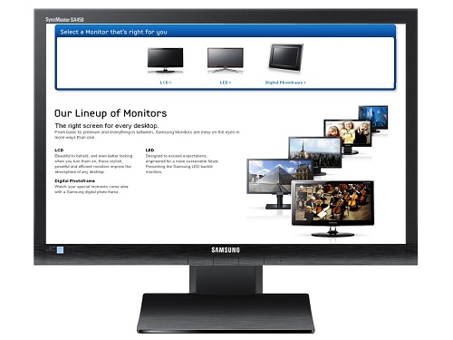 三星SA450的外觀(guān)簡(jiǎn)潔、大方,磨砂黑色涂層、超窄邊框設(shè)計(jì)彰顯沉穩(wěn)、睿智的商務(wù)風(fēng)格。功能按鍵采用傳統(tǒng)物理按鍵設(shè)計(jì),位置合理,大小適中,標(biāo)識(shí)清晰,最大程度方便用戶(hù)調(diào)節(jié)設(shè)置。