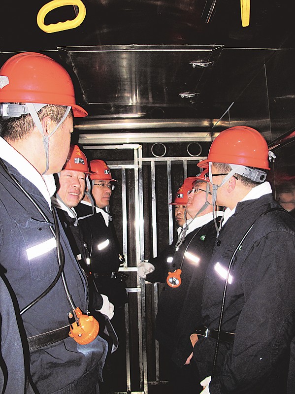 入井口猶如賓館的大廳,雪白的地板磚一塵不染,幾乎能照出人影,兩側(cè)是各種企業(yè)文化、安全常識(shí)的展板,以及各種有關(guān)煤的工藝品。走過“洗靴池”,記者和礦工們依次登上罐籠直線而下,“罐籠”是運(yùn)送礦工下井的升降梯,大約不到一分鐘,罐籠就把我們送到了地下300米的井底。