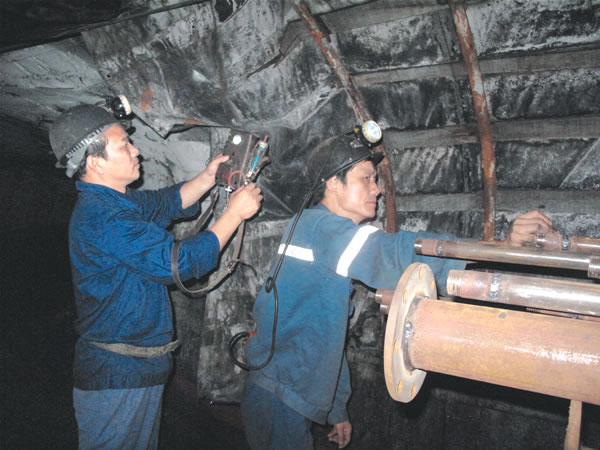 圖為9月5日晚班,安源礦組織安全檢查員對(duì)井下通風(fēng)、機(jī)電設(shè)施和炸藥庫等進(jìn)行抽查。記者 袁鵬/攝