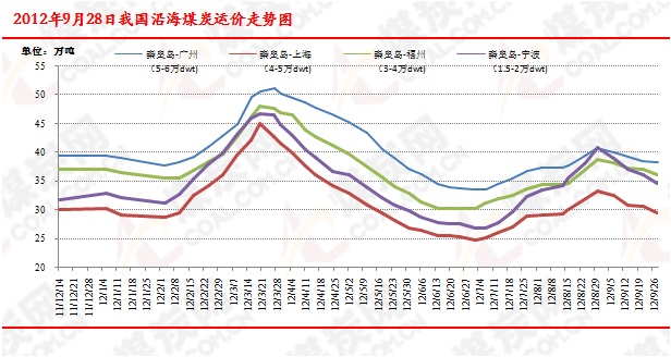沿海運費:截止到9月28日,現(xiàn)秦皇島港-廣州港(5-6萬DWT)運費38.2元/噸,周環(huán)比下跌0.3元;秦皇島-福州(3-4萬DWT)運費36元/噸,周環(huán)比下跌0.9元。天津-上海(2-3萬DWT)運價32.6元/噸,周環(huán)比回落1.3元;天津-鎮(zhèn)江(1-1.5萬DWT)運價40.6元/噸,周環(huán)比回落1.7元;秦皇島-寧波(1.5-2萬DWT)運價34.5元/噸,周環(huán)比回落1.6元,華南地區(qū)沿海運費逐漸企穩(wěn)。目前鑒于大秦線檢修前航運市場觀望情緒蔓延,運力過剩將繼續(xù)制約航運市場長期運行,海運費短期內(nèi)或?qū)⒗^續(xù)低位徘徊,延續(xù)震蕩走勢。