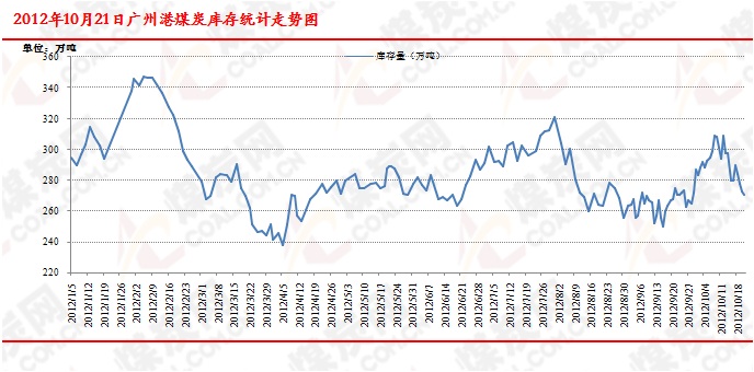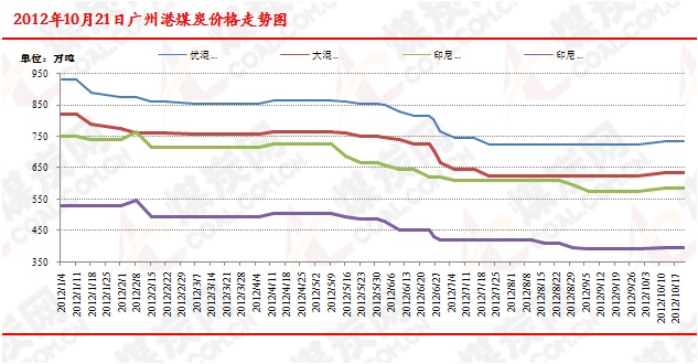 港口庫(kù)存方面:煤炭網(wǎng)信息研究中心數(shù)據(jù)顯示,截止到10月21日,廣州港存煤存煤270.25萬(wàn)噸,周環(huán)比減少27.02萬(wàn)噸。其中新沙公司存煤141萬(wàn)噸;周環(huán)比減少11萬(wàn)噸;西基公司存煤58萬(wàn)噸,周環(huán)比減少5萬(wàn)噸;新港公司存煤14.92萬(wàn)噸,環(huán)比減少9.31萬(wàn)噸;黃埔公司存煤56.33萬(wàn)噸,環(huán)比減少1.71萬(wàn)噸。