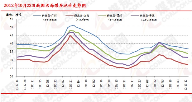 沿海運(yùn)費(fèi):截止到10月22日,現(xiàn)秦皇島港-廣州港(5-6萬(wàn)DWT)運(yùn)費(fèi)36.8元/噸,周環(huán)比保持不變;秦皇島-福州(3-4萬(wàn)DWT)運(yùn)費(fèi)33.8元/噸,周環(huán)比下跌0.2元。天津-上海(2-3萬(wàn)DWT)運(yùn)價(jià)30.4元/噸,周環(huán)比回落0.1元;天津-鎮(zhèn)江(1-1.5萬(wàn)DWT)運(yùn)價(jià)36.7元/噸,周環(huán)比回落0.1元;秦皇島-寧波(1.5-2萬(wàn)DWT)運(yùn)價(jià)31.5元/噸,周環(huán)比保持不變。近期下游電廠日耗持續(xù)偏低,電廠存煤可用天數(shù)接近25天高位水平,以及大秦線檢修形成對(duì)煤炭沿海運(yùn)輸形成利空。在下游需求不足,以及盈利承壓的影響下,海上煤炭運(yùn)輸供需矛盾日益突出,船舶公司長(zhǎng)時(shí)間虧損所造成的經(jīng)營(yíng)壓力,以及成本構(gòu)成因素將對(duì)海運(yùn)費(fèi)形成支撐,致使其不會(huì)在深度下滑,但是后期仍將維持低迷運(yùn)作態(tài)勢(shì)。