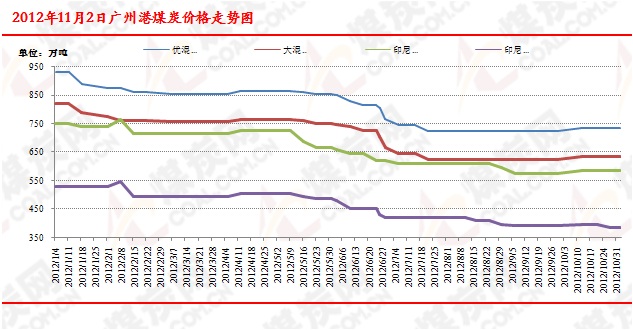 港口庫(kù)存方面:煤炭網(wǎng)信息研究中心數(shù)據(jù)顯示,截止到11月2日,廣州港存煤249.57萬噸,周環(huán)比減少8.65萬噸。其中新沙公司存煤134萬噸;周環(huán)比增加2萬噸;西基公司存煤51萬噸,周環(huán)減少9萬噸;新港公司存煤12.9萬噸,環(huán)比增加1.2萬噸;黃埔公司存煤51.66萬噸,環(huán)比減少2.83萬噸。
