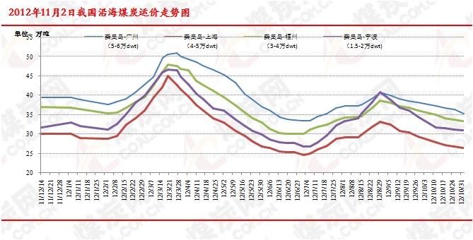 沿海運(yùn)費(fèi):截止到11月2日,現(xiàn)秦皇島港-廣州港(5-6萬DWT)運(yùn)費(fèi)35.3元/噸,較26日下跌1元;秦皇島-福州(3-4萬DWT)運(yùn)費(fèi)33.4元/噸,下跌0.3元。天津-上海(2-3萬DWT)運(yùn)價(jià)29.7元/噸,回落0.4元;天津-鎮(zhèn)江(1-1.5萬DWT)運(yùn)價(jià)35.9元/噸,回落0.4元;秦皇島-寧波(1.5-2萬DWT)運(yùn)價(jià)30.9元/噸,下降0.3元。截止到11月2日沿海六大電廠存煤總量為1410萬噸,周環(huán)比減少12萬噸;存煤可用天數(shù)為24.8天,較上周同期減少0.8天。近期秦皇島港錨地船舶數(shù)量在90艘左右的水平低位運(yùn)行。下游電廠受高庫(kù)存和第日好雙重制約,大大減弱了電廠煤的積極性。