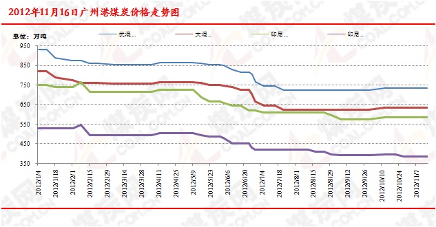 【動力煤市場】本周廣州港煤炭市場穩(wěn)定運行,港口存煤繼續(xù)呈現(xiàn)增長態(tài)勢,逼近300萬噸。內(nèi)外貿(mào)煤炭價格繼續(xù)持穩(wěn),沒有明顯變化。 印尼煤炭市場受上周價格下跌的影響,成交情況并沒有有所提升。隨著北方動力煤市場價格的下跌,沿海動力煤市場的持續(xù)低迷,加上進口印尼煤的價格優(yōu)勢在國內(nèi)已逐漸變?nèi),年底前國?nèi)煤炭價格回升的幾率較小。截止到11月16日,廣州港存煤297.89萬噸,較上周同期上漲19.17萬噸。現(xiàn)港口內(nèi)貿(mào)煤炭價格維持穩(wěn)定,其中山西優(yōu)混5500大卡港口庫提價725元/噸,山西大混山5000大卡港口庫提價630-640元/噸;大混4500大卡港口庫提價545-555元/噸。神木優(yōu)混1號Q5500A12V28S0.3港口庫提價750元/噸,神木塊煤Q6100A4V28S0.2港口庫價1020元/噸。外貿(mào)煤方面:現(xiàn)澳洲煤Q5000大卡港口庫提價610-620元/噸;Q5500大卡CIF價650元/噸;印尼煤Q4700大卡港口到岸參考價580-590元/噸,Q3800大卡港口庫提價380-390元/噸;越南洪基11AQ4800大卡港口庫提價600-610元/噸。截止到目前印尼至中國南部沿海的煤炭運費保持穩(wěn)定,目前印尼加里曼丹港-廣州港(5-6萬噸)運價8.5美元/噸,較上期下跌0.5美元,印尼加里曼丹港-廣州港(6-7萬噸)運價7.5美元/噸,較上期保持穩(wěn)定。