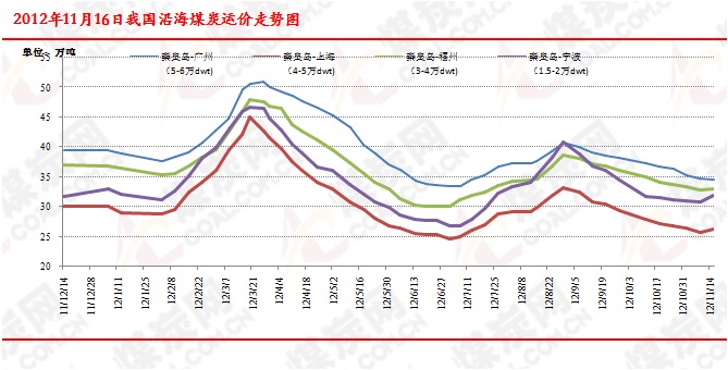 沿海運費:截止到11月16日,現(xiàn)秦皇島港-廣州港(5-6萬DWT)運費34.6元/噸,較9日下跌0.1元;秦皇島-福州(3-4萬DWT)運費33元/噸,微漲0.2元。天津-上海(2-3萬DWT)運價30元/噸,回升0.5元;天津-鎮(zhèn)江(1-1.5萬DWT)運價37.3元/噸,回升1.7元;秦皇島-寧波(1.5-2萬DWT)運價31.8元/噸,回升1元。截止到11月16日沿海六大電廠存煤總量為1399萬噸,周環(huán)比增加12萬噸;存煤可用天數(shù)為22.35天,較上周同期增加0.13天。本期沿海煤炭運價均出現(xiàn)弱勢回暖的局面,漲勢情況表現(xiàn)不一。一方面由于前期持續(xù)下跌的運價已經(jīng)跌至船東的成本線上,運價繼續(xù)下跌的空間有限,部分船東采取封航停運來削減市場剩余運力。另一方面,需求不足使得運輸市場貨源減少,租船成交清淡,對運價的上漲預期形成制約。本期運價上漲主要集中在短途的小型船舶上面,大型運輸船舶運價繼續(xù)呈現(xiàn)弱勢下探,不過下探幅度已經(jīng)陸續(xù)縮小。目前沿海運輸價格的上漲和下跌勢頭仍不明朗,預計近期運價將呈現(xiàn)底部震蕩趨勢,運價的回暖要等到冬季用煤需求提升等利好因素的進一步刺激。