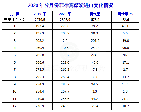 據(jù)菲律賓財(cái)政部海關(guān)局The Bureau of Customs(BOC)發(fā)布的初步統(tǒng)計(jì)數(shù)據(jù),2020年12月,菲律賓煤炭進(jìn)口248.5萬噸,同比減少10.2%,環(huán)比下降2.8%。1-12月,菲律賓煤炭進(jìn)口累計(jì)為2302.9萬噸,仍然保持突破2000萬噸,但比2019年大幅下降,比上年減少673.4萬噸,同比下降22.6%。