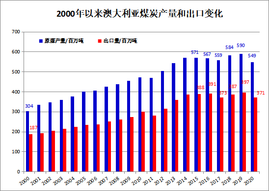 據(jù)澳大利亞聯(lián)邦工業(yè)、科學(xué)、能源和資源部(Department of Industry, Science,Energy and Resources) 發(fā)布的2021年一季度《資源和能源季報》(Resources and Energy Quarterly,March 2021)數(shù)據(jù)顯示,2020年,澳大利亞原煤(Black coal, raw)產(chǎn)量5.49億噸(不含褐煤),比上年減少4125萬噸,下降7.0%;可銷售商品煤產(chǎn)量(Black, saleable)4.34億噸,比上年減少2919萬噸,下降6.3%。