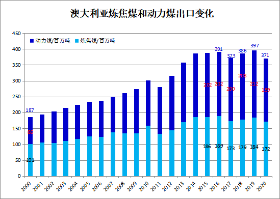 由于受到出口量減少疊加出口價格下滑的影響,2020年澳大利亞煤炭出口額顯現(xiàn)30年來最大降幅,動力煤出口收入下降26.7%,冶金煤出口收入下降了34.3%。