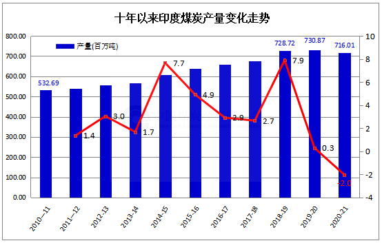 據(jù)印度煤炭部(Ministry of Coal)最新公布的初步統(tǒng)計(jì)數(shù)據(jù), 2020-21財(cái)年(2020年4月-2021年3月),印度全國(guó)煤炭產(chǎn)量(不含褐煤)累計(jì)為7.16億噸,比上年同期減少1486萬(wàn)噸,同比下降2.0%。其中,國(guó)有印度煤炭公司(CIL)煤炭產(chǎn)量5.96億噸,同比下降0.98%;辛格南尼煤礦公司(SCCL)產(chǎn)量5058萬(wàn)噸,同比下降21.02%;自用煤礦(Captive)產(chǎn)量6302.5萬(wàn)噸,同比增長(zhǎng)8.9%;其它煤礦(Others)產(chǎn)量615萬(wàn)噸,同比下降9.8%。