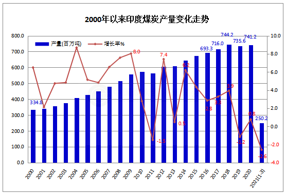 最近,環(huán)球數(shù)據(jù)公司(GlobalData)預(yù)測(cè),2021年,印度煤炭產(chǎn)量可能達(dá)到8.27億噸,將在2020年增長(zhǎng)0.7%的基礎(chǔ)上繼續(xù)增長(zhǎng)9%。